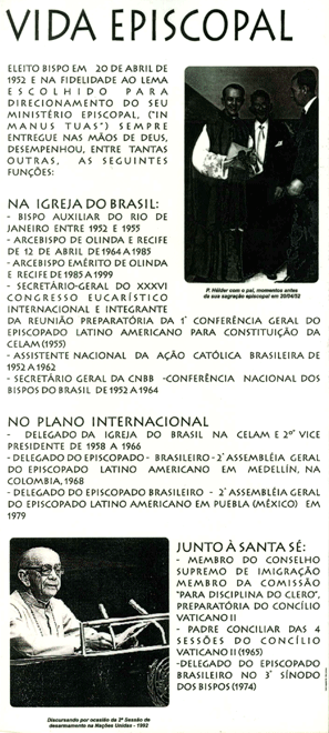Os leigos e as responsabilidades nacionais e internacionaisAtravés da Ação Católica de Pio XI, leigos e leigas foram seus mestres de vida, para a atuação no mundo e para uma espiritualidade longe dos ranços clericais. No Rio, o então Pe. Helder Câmara prosseguiu com seu envolvimento com os leigos, iniciado no Ceará com a Juventude Operária Católica, a Legião Cearense do Trabalho e a Liga dos Professores Católicos. Em 1950, tornou-se Assistente da nova ação católica especializada, convertendo em nacional seu raio de ação até então limitado ao Rio de Janeiro. Nesse mesmo ano de 1950, suas funções de assistente nacional da Ação Católica levaram-no por primeira vez a Roma, para o Congresso Internacional da Ação Católica. Essa viagem propiciou-lhe o primeiro contato com Mons. Giovanni Baptista Montini, principal auxiliar do Papa Pio XII, a quem propusera a criação da Conferência dos Bispos do Brasil.
